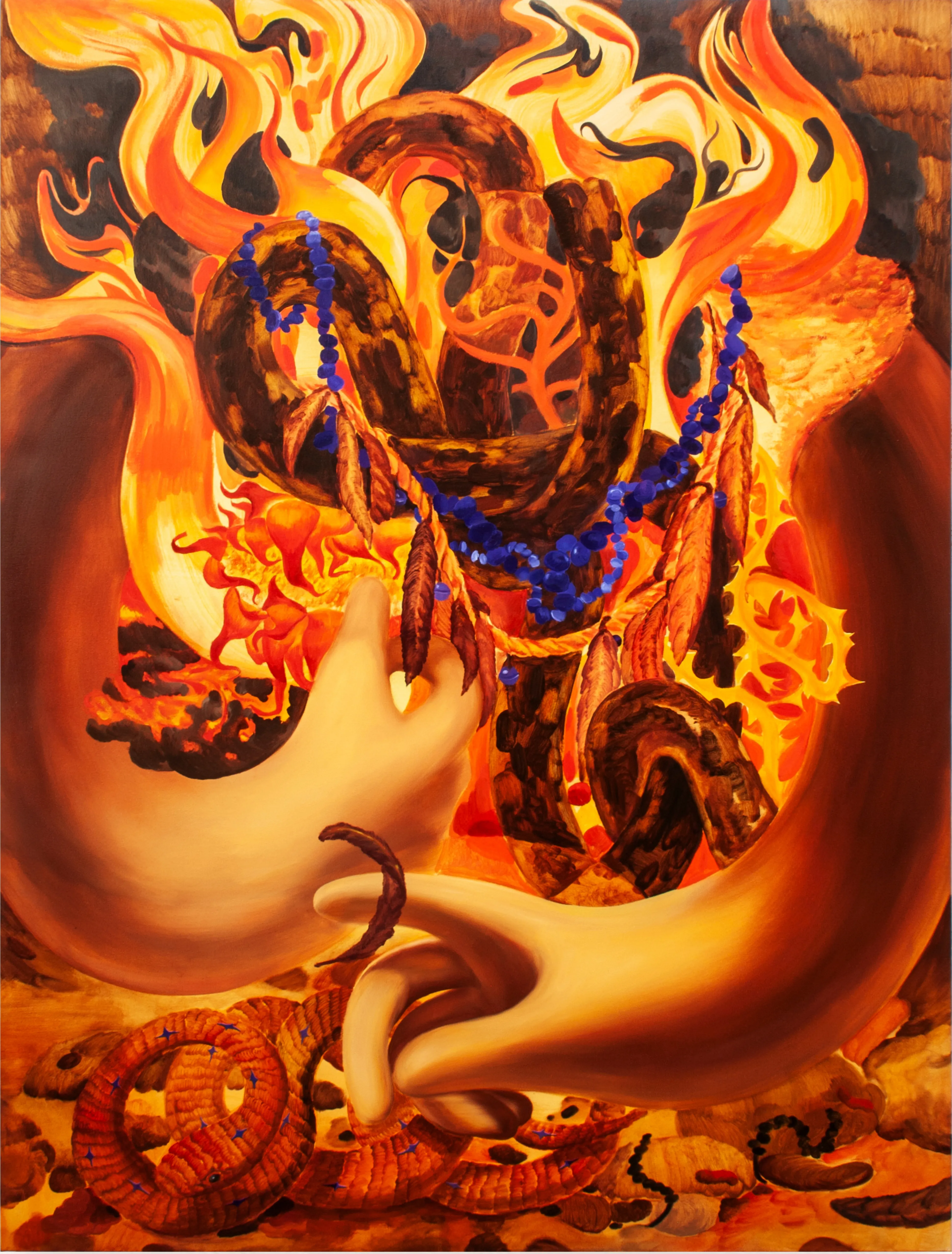Q2:三幅名为《金枝》的作品,某种程度上延续了你早期画“手”的作品。其实在我的印象中,你一直在进行较为抽象式的创作,因为先前关注的作品和展览,你的抽象绘画非常抓人,以至于我没有想过你会“愿意”创作较为具象的作品。你是否可以说下,当初“手”让你产生创作兴趣的缘由?不知道我的感受是否“正确”,因为我从你的作品中,所能直接感受到的是一种“流动”感。无论是你抽象作品中,所描绘的某种类似于将“风”具像化的画面,还是你所选择描绘的例如火焰、蛇、藤蔓状的植物,又或者是手(人体最为灵活的部分),似乎都是能够产生“流动”意味的事物,这是你的有意为之,还是在无意中所达成的结果?