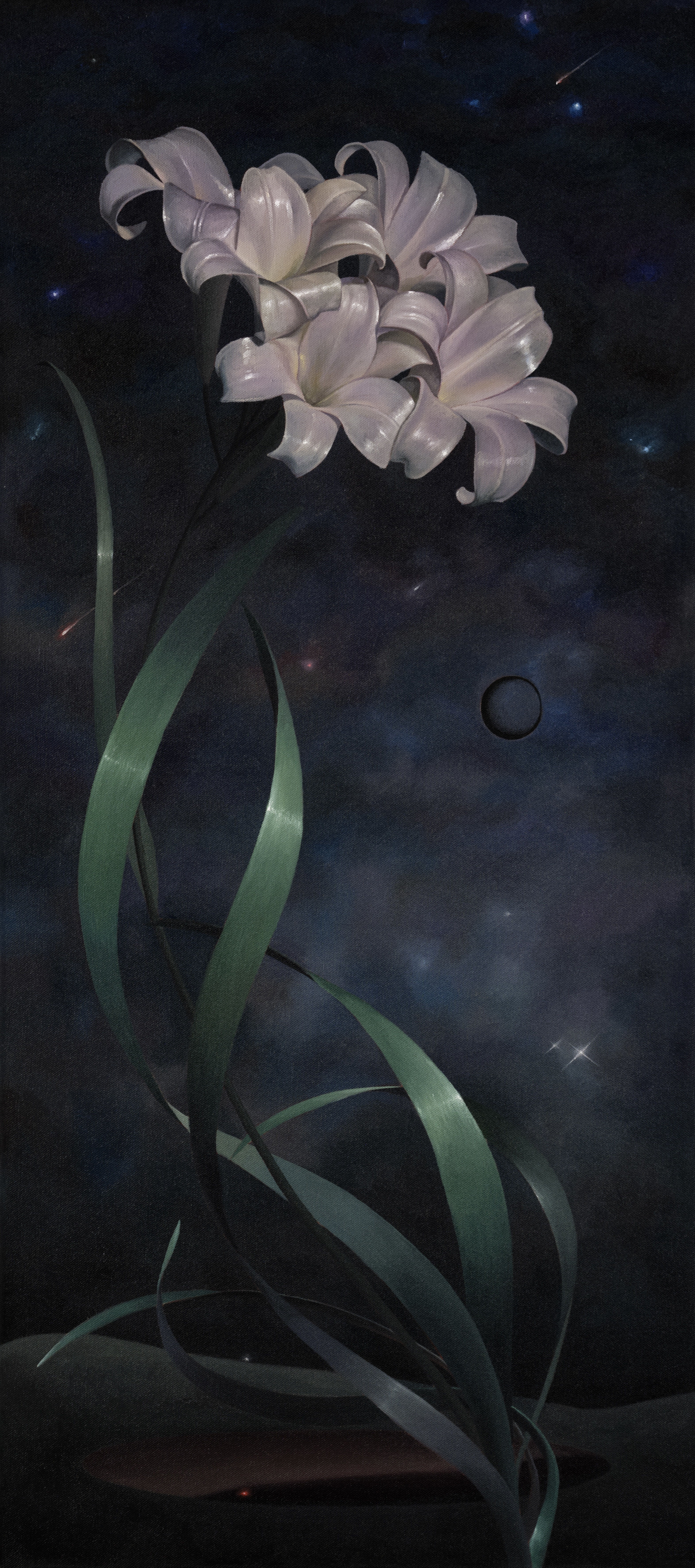 Q5:我其实很喜欢你会在作品中埋下的“线索”,像是《死掉的许愿池》这幅画,原本只存在于童话的许愿池代表正向与希望,而你认为许愿池的力量并非无穷无尽,它会因帮助人们实现愿望而逐渐枯竭,与此同时许愿的人也会为此付出相应代价。花瓣的使命原本是保护花蕊,而作品中的百合为了保持盛开,所付出的代价是失去作为“心”的花蕊。我起初不明白作品为什么这样命名,但明白之后,我被这件作品所隐含的残酷现实所打动了。