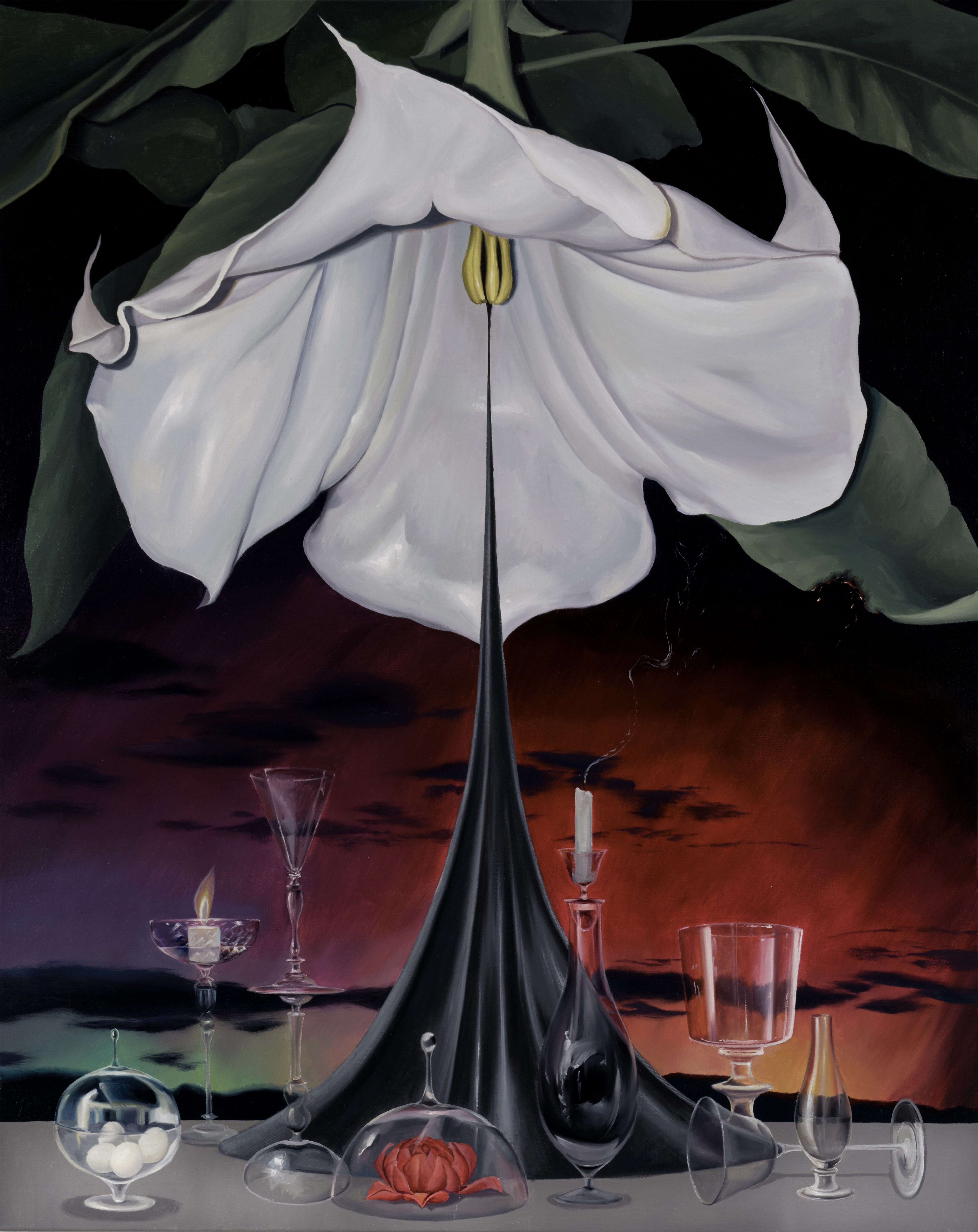 Q3:这次的新作中,我发现“器物”成为了仅次于花的主角。像是酒杯、盘子、花瓶、圣杯,还有作品《安息吧黎明》和《模糊的背叛》里,像高脚杯一样的烛台。这些日常化的器具早在之前,一般会作为配角出现在作品的背景中,但在“物语”系列中,仿佛你让它们代替了花在你作品的首要位置。你是否还记得开始描绘“器物”的缘由?又是怎样的原因使你去创作“物语”系列的作品?与此同时,我还好奇是否“杯子”这种容器在你的创作中有着特殊代表性?例如在西方符号学中,杯子与情感有着直接的关联。